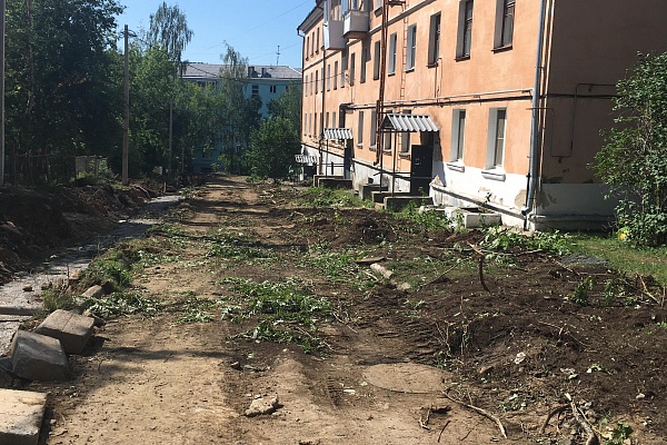 Комплексное благоустройство дворовой территории продолжается и в выходные. Разобрали пешеходную дорожку вдоль дворовой территории